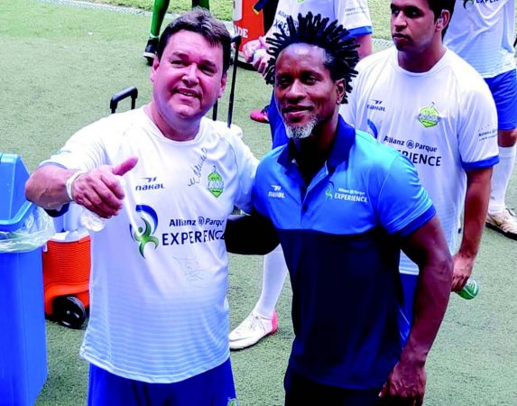 O empresário Maurício Romano, sócio diretor da Dinagro de Ribeirão Preto, com o ex-jogador e ídolo do Palmeiras, Zé Roberto, durante jogo festivo promovido pelo Palmeiras, no Allianz Parque, em São Paulo.