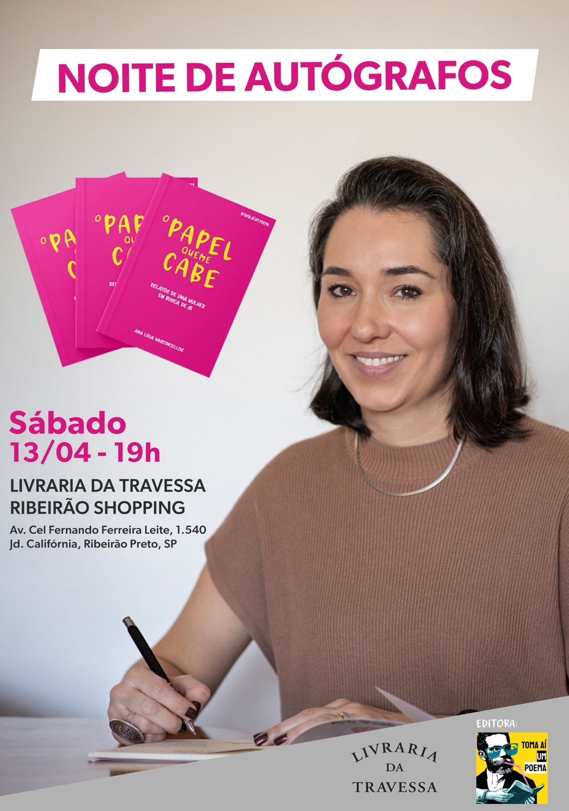 A jornalista Ana Lígia Vasconcellos Farath realiza neste sábado (13/04), a partir das 19h, na livraria da Travessa do RibeirãoShopping, uma noite de autógrafos do livro “O papel que me cabe: relatos de uma mulher em busca de si”.
