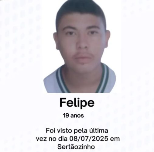 Felipi Gabriel Silva, de 19 anos, está desaparecido desde a manhã de segunda-feira, 8 de julho, em Sertãozinho (SP). Segundo registro feito pela mãe do jovem na Delegacia de Polícia Civil da cidade, ele saiu de casa por volta das 11h em uma bicicleta, sem informar o destino, e não foi mais visto.
