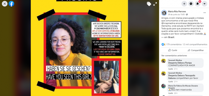 Por meio de outra publicação, nesta quinta-feira, 2 de julho, Maria Rita informou que o desaparecimento da filha já está no site oficial da polícia alemã.