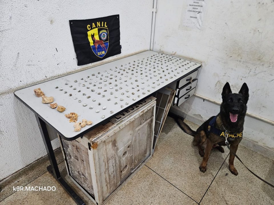 No entanto, no chão havia várias embalagens normalmente utilizadas no fracionamento da droga. Acreditando que o local pudesse ser ponto de venda de entorpecentes, o cão de faro Apache foi empregado nas buscas.