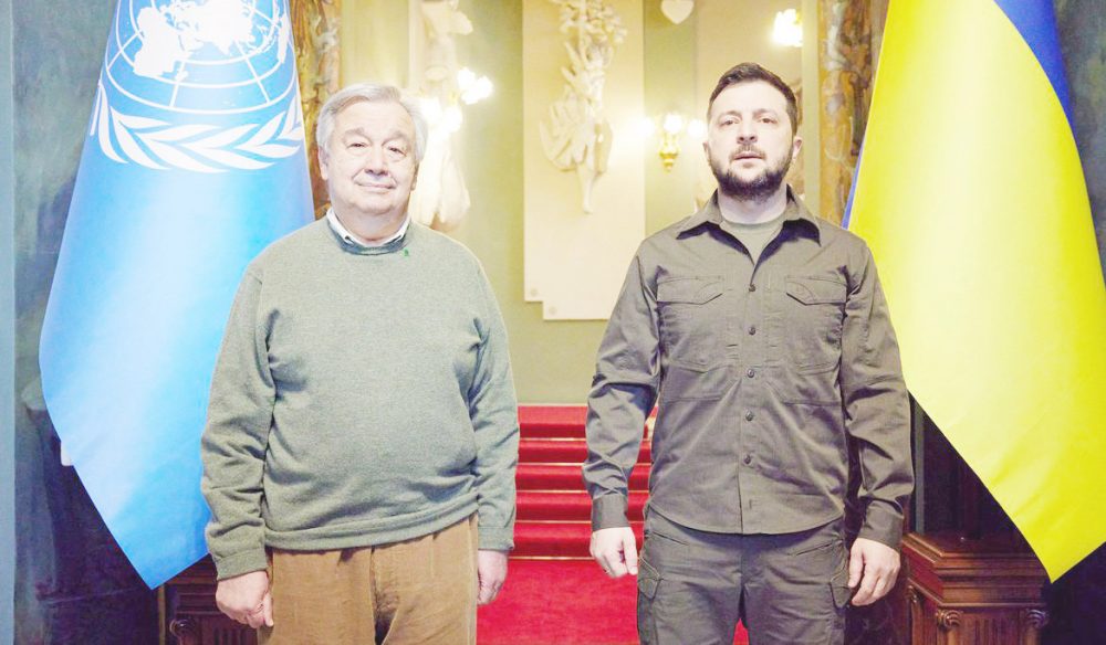 “Ontem (quarta-feira, dia 27), Guterres estava senta­do em uma grande mesa no Kremlin e hoje há explosões acima de sua cabeça”, disse ironicamente, referindo-se à visita de Guterres a Moscou no início desta semana, onde foi recebido pelo presidente russo, Vladimir Putin.