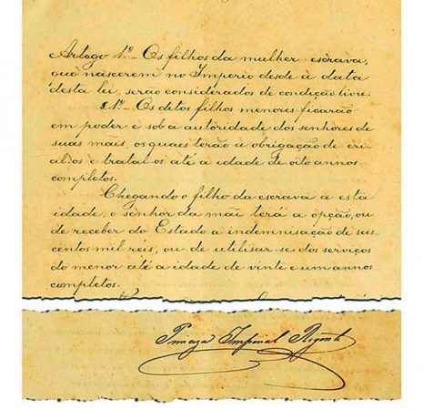 “Os filhos de mulher escrava que nascerem no Império desde a data desta lei, serão considerados de condição livre”. O texto assinado pela princesa Isabel, em 28 de setembro de 1871, ficou conhecido como a Lei do Ventre Livre ou Lei Rio Branco. A legislação foi publicada passados 21 anos da Lei Eusébio de Queirós, que proibiu o tráfico negreiro no Brasil Imperial.