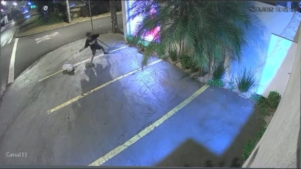 As imagens mostram o momento em que um homem se aproxima da vitrine, arremessa um objeto para quebrar o vidro e, em seguida, entra no comércio. Em poucos minutos, o suspeito recolhe diversos itens da loja e foge do local.