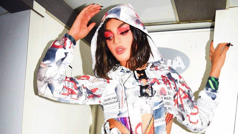 Além de um maiô com as cores do arco-íris, ela vestiu um conjunto feito de reportagens de jornal sobre crimes ligados à homofobia. O destaque é para a frase em vermelho que diz “Parem de nos matar”.