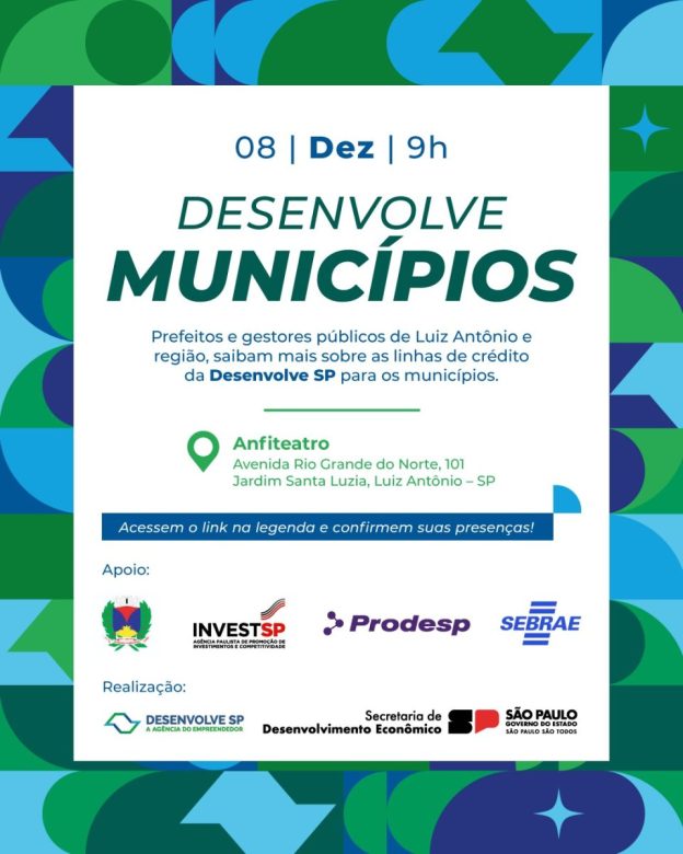 A programação tem início às 9h, no Anfiteatro Municipal, com o Desenvolve Municípios, encontro direcionado a prefeitos, gestores públicos e equipes técnicas da região. O evento apresenta as linhas de crédito e soluções financeiras da Desenvolve SP voltadas especificamente para investimentos em infraestrutura, inovação e melhoria dos serviços públicos municipais. A iniciativa conta com apoio da InvestSP, Prodesp, Sebrae e da Prefeitura de Luiz Antônio. Inscrições: https://docs.google.com/forms/d/e/1FAIpQLSc14EKqCMUARn98aTKXK5v0fdJvWr5iDzke0s5l0qKU4OXW-w/viewform?usp=header