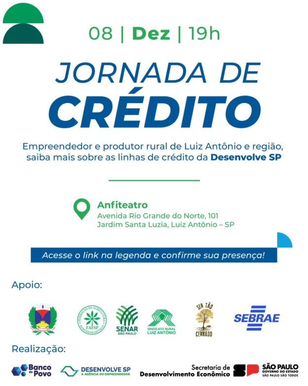 À noite, às 19h, também no Anfiteatro, será realizada a Jornada de Crédito, destinada a empreendedores e produtores rurais do município e cidades vizinhas. A ação busca orientar o público sobre financiamentos para expansão de negócios, aquisição de equipamentos e modernização produtiva. O evento tem apoio do Banco do Povo, Faesp, Senar-SP, Sindicato Rural de Luiz Antônio, Sertão Cerrado, além do Sebrae. Inscrições: https://docs.google.com/forms/d/e/1FAIpQLSdolTAGeqckUqisfUxTpwApGoZjHJb5ttOOyeXrX2unn-Ofbw/viewform?usp=header