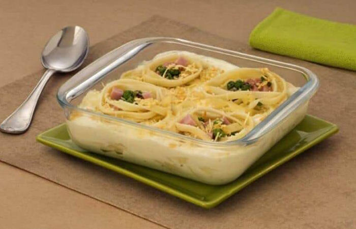 3. Adicione os ninhos de macarrão no refratário e recheie-os com a ervilha e o presunto. Despeje o molho restante e polvilhe com parmesão.