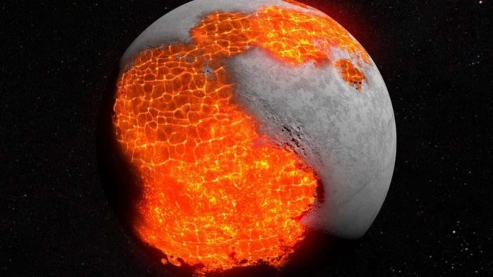 Ilustração artística do oceano de magma e primeira crosta rochosa na Lua. Imagem: NASA