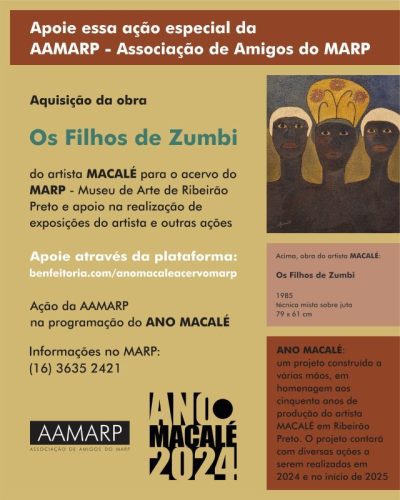 A AAMARP – Associação de Amigos do MARP lançou uma “vaquinha” on-line para aquisição de uma importante pintura de Jaime Domingos Cruz, o Macalé. A ação faz parte das comemorações do “Ano Macalé” (2024) que celebra os 50 anos de produção do artista em Ribeirão Preto.