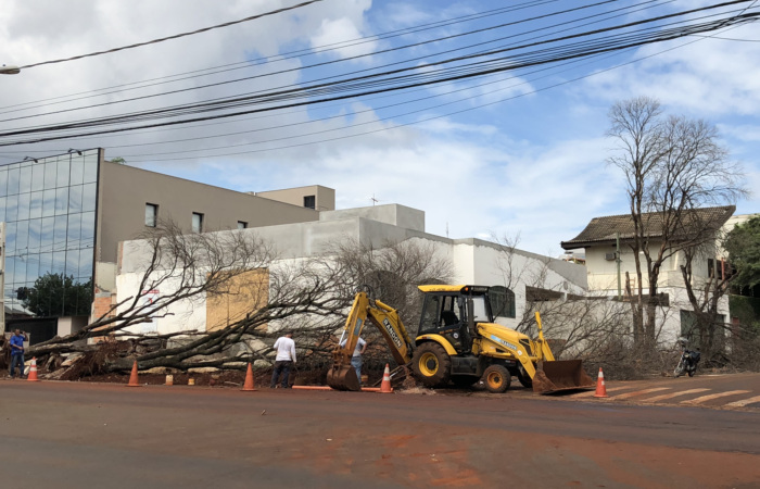 O prédio, que fica na altura do número 2.500 está em reforma e as árvores (aparentemente do tipo Ficus), que estão sendo extraídas na tarde deste sábado (10) estão todas secas.