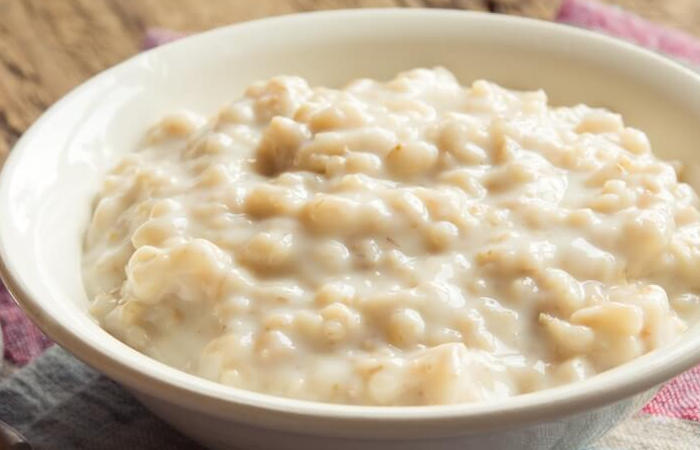 1. Em uma panela, leve ao fogo a aveia e o leite mexendo sempre até engrossar.