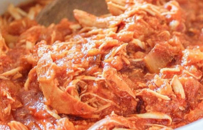 6. Após o frango cozinhar, reserve o excesso de caldo para usar em outra receita e desfie-o com um garfo.