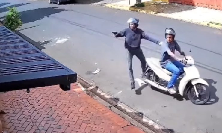 O homem conversava com uma conhecida no interior da garagem de sua residência e o portão estava aberto. Os dois assaltantes chegaram em uma motocicleta Honda Biz branca. O homem que estava na garupa saltou antes mesmo que a moto parasse completamente, já com arma em punho.
