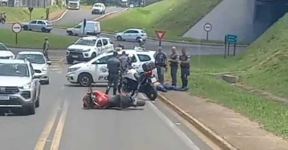 Ao tentar fugir do cerco policial, o motociclista tentou entrar na alça de acesso à Avenida Ticiano Mazzetto, altura do km 319, nas Chácaras Rio Pardo. Por conta da alta velocidade, o piloto perdeu o controle da moto e os dois foram ao solo. Ambos sofreram ferimentos graves. Próximo ao dois, os policiais encontraram um simulacro de arma de fogo.