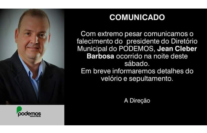 Faleceu no sábado, 24 de março, o presidente do diretório municipal do Podemos de Ribeirão Preto, Jean Cleber Barbosa. A suspeita é que ele tenha morrido vítima de dengue hemorrágica. Barbosa estava trabalhando na cidade de Sertãozinho quando passou mal e foi levado para a Unidade de Pronto Atendimento (UPA) daquela cidade. Ele morreu enquanto aguardava internação hospitalar.