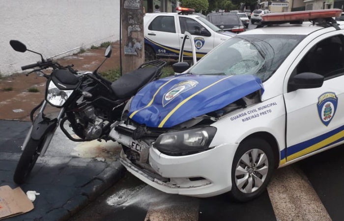 Acidente envolvendo motocicleta e viatura da Guarda Civil Municipal (GCM) na tarde de sábado (12) no cruzamento das ruas Espírito Santo com Maranhão, no Ipiranga, zona Norte de Ribeirão Preto.