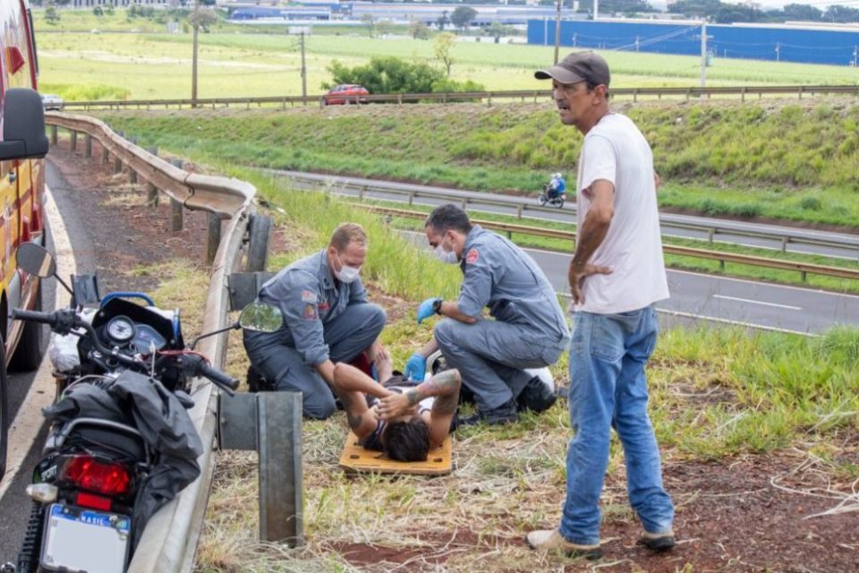 Um motociclista ficou ferido, na manhã desta quarta-feira (24), após colidir com sua moto contra uma defensa metálica. O acidente aconteceu na primeira saída da Rodovia Abrão Assed (SP-333) para o Recreio Anhanguera, zona Leste de Ribeirão Preto, logo após o trevão sobre a Rodovia Anhanguera (SP-330).