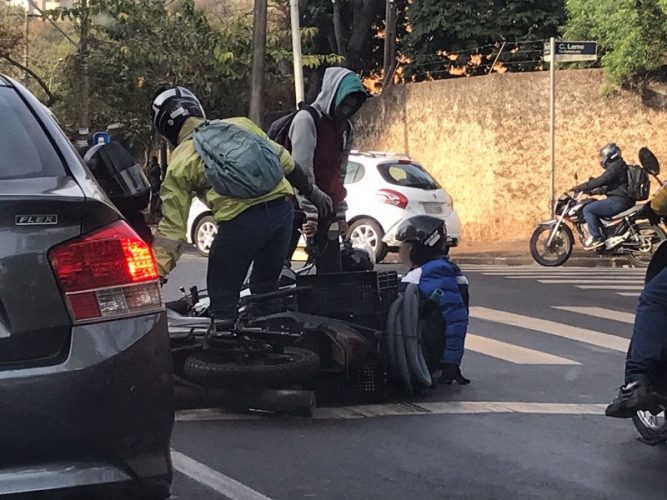 O semáforo para quem seguia pela Avenida Pio XII em direção à Avenida Caramuru estava vermelho e três motos, além de três veículos, aguardavam o sinal verde para prosseguir. Uma motocicleta com duas pessoas se aproximou e não percebeu o sinal fechado. Acabou colidindo com outras três motos.