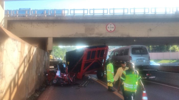 O motorista acessou o local para fazer o retorno e, sem perceber que excedia na altura, acabou batendo a máquina agrícola sob o viaduto. Com o choque, o implemento caiu na pista, obstruindo uma das faixas locais,