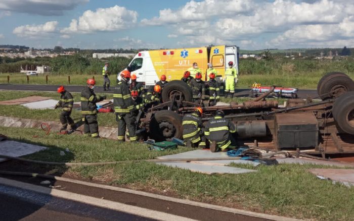 O motorista de um caminhão ficou preso nas ferragens do veículo após capotar na Rodovia Prefeito Antônio Duarte Nogueira (Anel Viário Sul), próximo à entrada do bairro City Ribeirão, na tarde desta quarta-feira (8).
