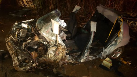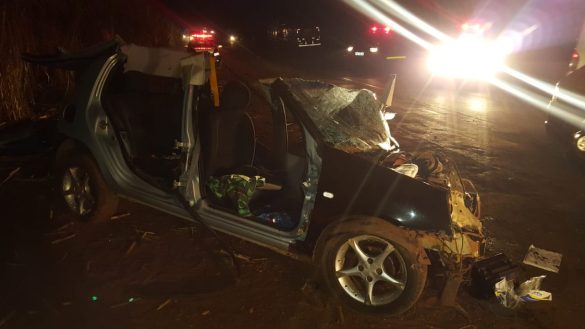 Reault Clio fica destruído ao colidir com caminhão de cana- Fotos: divulgação da Polícia Militar