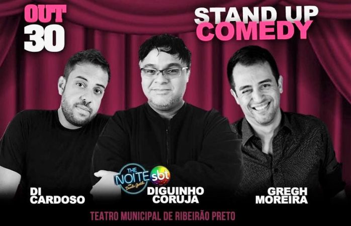 Nesta quarta-feira, 30 de outubro, às 20 horas, o Teatro Municipal de Ribeirão Preto receberá a “Noite do Stand-up Comedy”, com as participações de Diguinho Coruja – uma das atrações do programa de TV “The Noite”, de Danilo Gentilli, que vai ao ar pelo SBT –, Di Cardoso e Gregh Moreira. Além deles, subirão ao palco dois ribeirão-pretanos que estão mandando bem nas imitações e no humor de cara limpa: Caduzinho PC e Tom Guimarães.