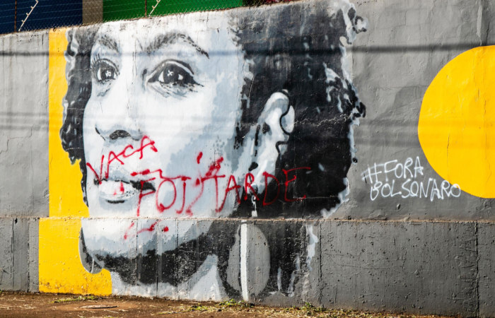 O mural com o retrato de Marielle Franco, vereadora do Psol assassinada em 14 de março de 2018, no Rio de Janeiro, foi pichado com insultos. Sobre o rosto da militante dos direitos dos negros e das mulheres foram grafadas, com tinta vermelha, as palavras “vaca” e “foi tarde”.
