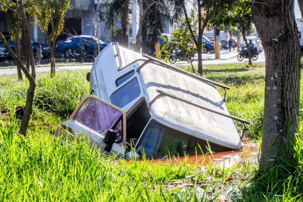 Foi quando ocorreu o inusitado. Quando o carro subiu no terreno do acostamento, acabou caindo em uma espécie de lago, com cerca de dois metros de profundidade, formado por água acumulada naquele local.