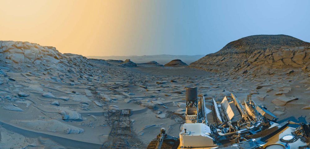 Na colorização da imagem, o azul foi adicionado às partes do cartão-postal capturadas pela manhã e o amarelo, às partes retratadas de tarde. O Curiosity foi construído pelo Laboratório de Propulsão a Jato da Nasa, administrado pela Caltech em Pasadena, na Califórnia, que também monitora outro rover em ação no planeta, o Perseverance. Mas foi um pequeno helicóptero de exploração, o Ingenuity, que chamou a atenção recentemente.