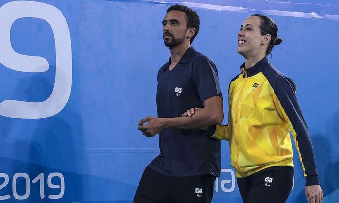 O treinador Leonardo Tomasello junto com a nadadora Carol Santiago,ouro no Parapan de Lima (2019) nos 100m livre – Ale Cabral/CPB/Direitos Reservados