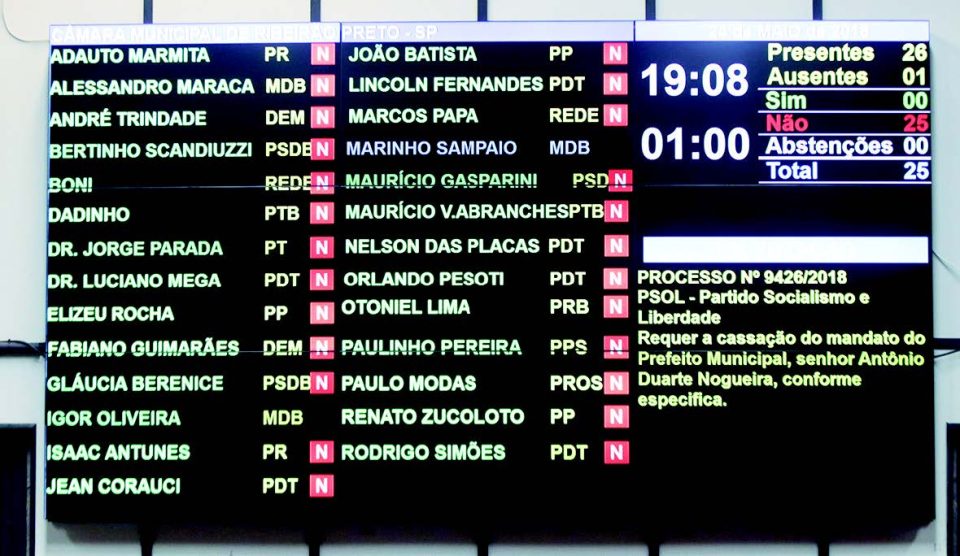 Por unanimidade, a Câma­ra de Ribeirão Preto rejeitou, na sessão desta quinta-feira, 24 de maio, denúncia protocolada pelo Partido Socialismo e Li­berdade (PSOL) contra o pre­feito Duarte Nogueira Júnior (PSDB). Com o argumento de que o tucano estaria descum­prindo ordem judicial que bar­rou o programa de terceirização “Saúde Melhor”, a legenda pediu ao Legislativo a instalação de Co­missão Processante para analisar a possibilidade de cassação do mandato do chefe do Executivo.