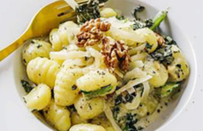 Retire o nhoque quando perceber que eles flutuam até o topo e jogue o molho pesto de manjericão.
