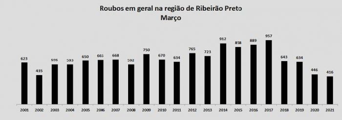 De acordo com dados di­vulgados pela Secretaria de Segurança Pública do Estado de São Paulo (SSP-SP), a re­gião de Ribeirão apresentou redução dos casos de roubos em geral no último mês de março, quando comparado com o mesmo período do ano anterior. Com uma diferença de 30 boletins, a quantidade passou de 446 para 416. O nú­mero é o menor da série histó­rica, iniciada em 2001.