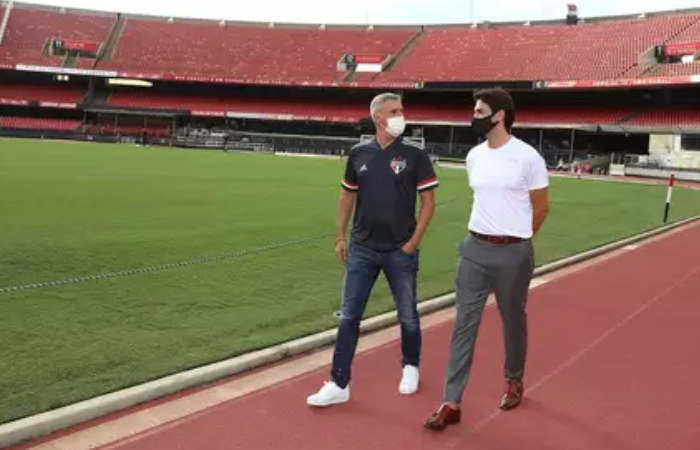 Kaká acompanhou Crespo durante a visita ao estádio do Morumbi. O técnico argentino também conheceu outras dependências do São Paulo e teve contato com o presidente Julio Casares e alguns membros da diretoria de futebol.