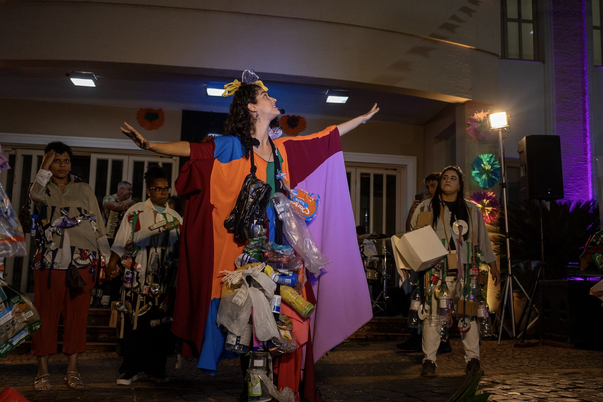 Na performance artística, os atores André Cruz, Gracyela Gitirana, Luara Pepita e Aline Neli se deslocam interagindo com as pessoas e o espaço, em figurinos enormes, totalmente confeccionados com resíduos sólidos, sem nenhuma parte do corpo humano à vista. O coletivo “Lixo Zero” de Ribeirão Preto integra o projeto, atuando tanto no monitoramento como na informação especializada.