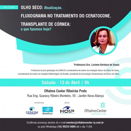 O Oftalmo Center, hospi­tal referência em atendimento, exames, diagnóstico e cirurgias oftalmológicas, realiza uma pa­lestra sobre olho seco, fluxogra­ma no tratamento do ceratocone e transplante de córnea no dia 13 de março, às 9 horas, na Rua Eng. Guaracy Ribeiro Monteiro, 55 – Jardim Nova Aliança.