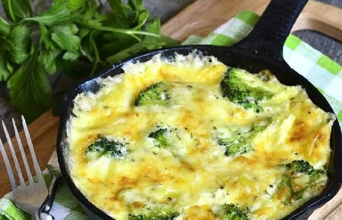 2. Refogue o peito de frango com o brócolis e coloque em uma forma e, por cima, despeje os ovos batidos.