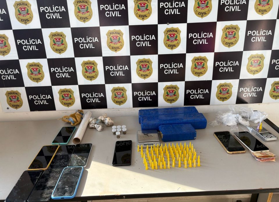 Além de drogas, dinheiro, celulares e outros objetos apreendidos, nove envolvidos com o tráfico foram presos (Foto: Polícia Civil/Divulgação)
