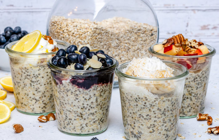 2. Em um vidrinho disponha a mistura de aveia e leite, por cima os cubos de manga, o gengibre e o coco.