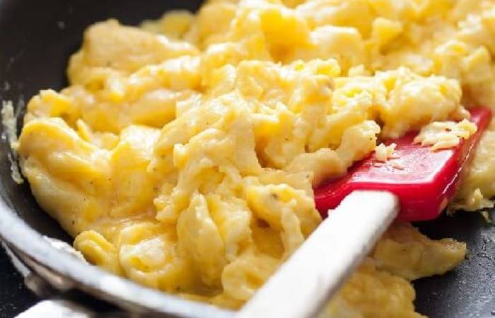 3. Derreta e espalhe a manteiga sobre uma frigideira ao fogo. Em seguida jogue a mistura, mexendo sempre e tomando cuidado para não formar uma casca no fundo da panela.