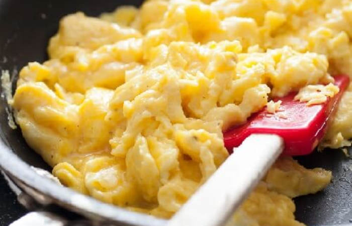 3. Derreta e espalhe a manteiga sobre uma frigideira ao fogo. Em seguida jogue a mistura, mexendo sempre e tomando cuidado para não formar uma casca no fundo da panela.