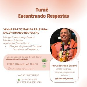 Acontece nesta quinta-feira, dia 06, às 19h30, a palestra gratuita “Encontrando Respostas” com o líder espiritual Purushatraya Swami.
