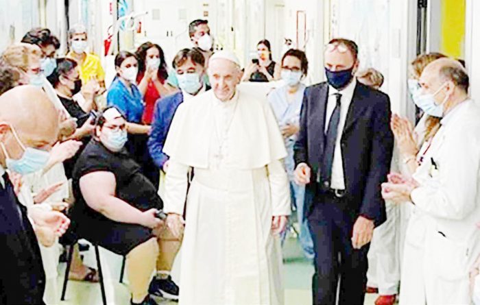 Essa foi sua primeira apa­rição pública após a cirurgia. Na tarde de terça-feira (13), véspera da alta, Francisco visitou a ala pediátrica de câncer do hospital em que es­tava internado. Em imagens divulgadas pelo Vaticano, o papa aparece em boas con­dições enquanto caminhava sem ajuda e cumprimentava crianças, pais e médicos.