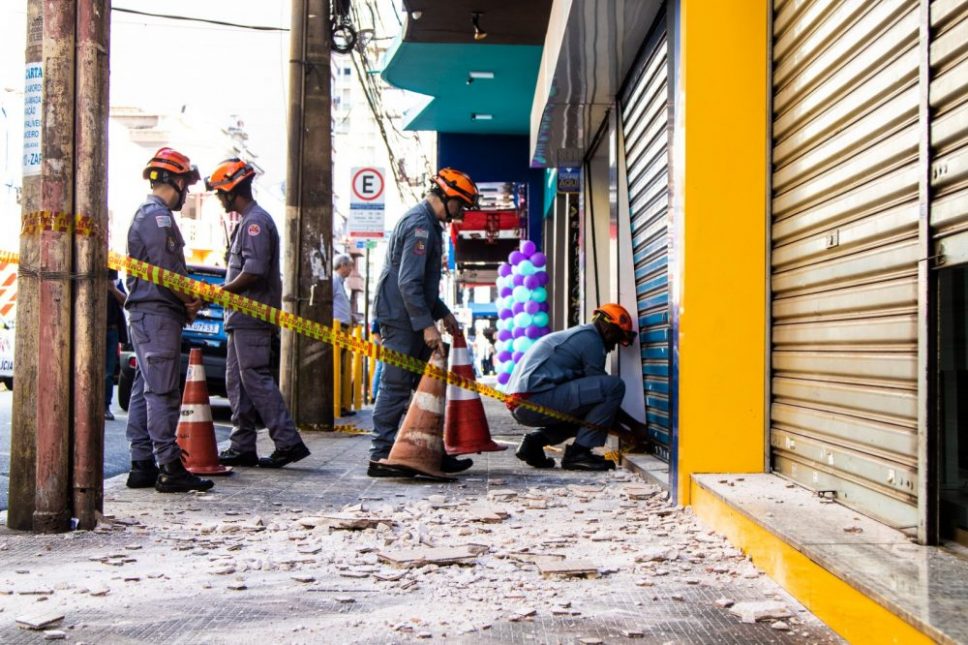 Parte da fachada de um prédio localizado na Rua São Sebastião, entre as ruas Visconde de Inhaúma e Tibiriçá, região central de Ribeirão Preto caiu, na manhã desta terça-feira (01) e trouxe pânico a moradores e comerciantes. O Corpo de Bombeiros foi chamado e isolou a área, comunicando à Defesa Civil.