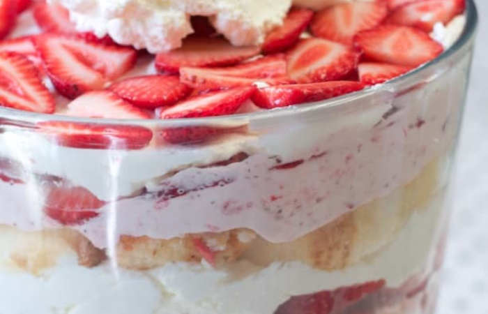 5. Em um refratário, coloque na seguinte ordem uma camada de bolacha (passe as bolachas no leite com açúcar rapidamente), uma camada de morangos picados e metade do creme.