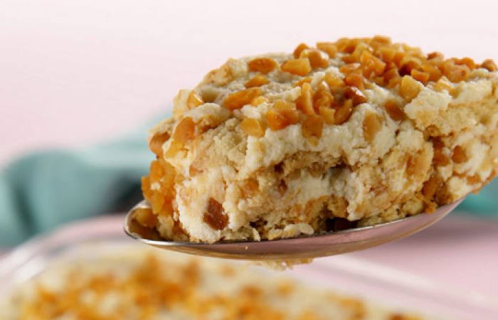 2. Em um refratário quadrado, com 22 cm de lado, monte o doce fazendo camadas com o creme, biscoitos passados no café misturado com a canela e as castanhas.