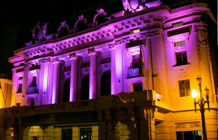 A fachada de um dos principais cartões postais e referência cultural de Ribeirão Preto, o Theatro Pedro II, no Quarteirão Paulista, no Centro Histórico da cidade, está iluminada de lilás em alusão à campanha Março Lilás, de conscientização sobre a importância da prevenção e tratamento do câncer do colo do útero.