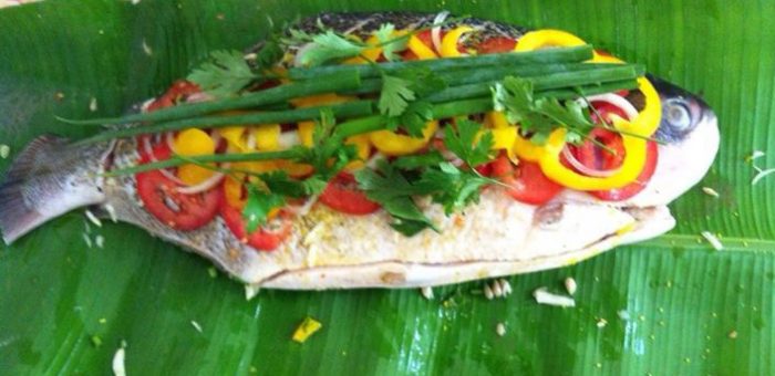 Se quiser, retire a folha de bananeira seca e sirva o peixe sobre uma folha nova e verde, untada com óleo.