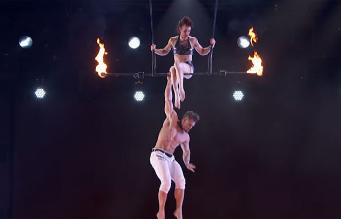 Um casal de trapezistas se envolveu em um acidente durante uma performance para o reality show America’s Got Talent. Tyce estava com os olhos vendados quando realizou uma acrobacia e perdeu contato com a esposa Mary, que despencou e caiu no palco do programa.